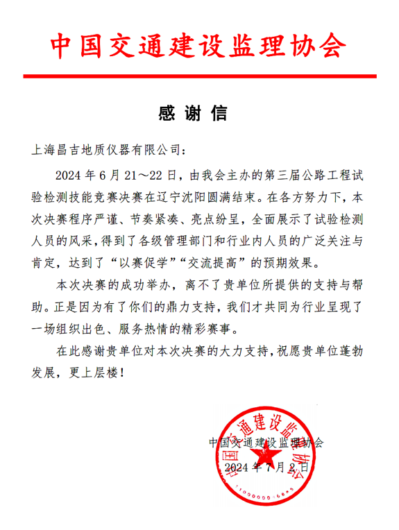 賽后我司收到中國交通建設(shè)監(jiān)理協(xié)會主的感謝信,上海昌吉作為此次競賽的支持方之一,收到主辦方的感謝信尤為欣喜,能在比賽平臺的搭建中提供強有力的保障設(shè)備,助力在建設(shè)事業(yè)中背后付出汗水的檢測試驗人員安心參賽。